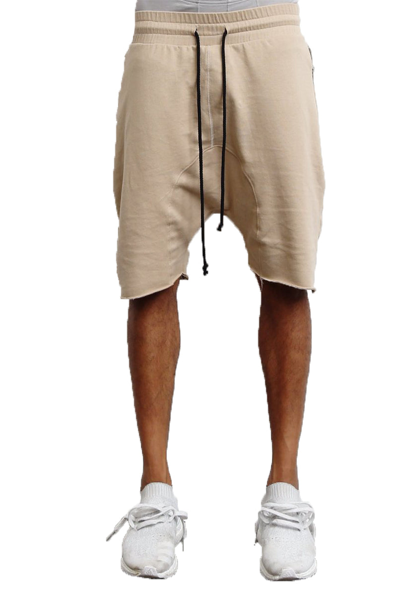 Drawstring enclosure at the waist, zip pockets, and a raw hem