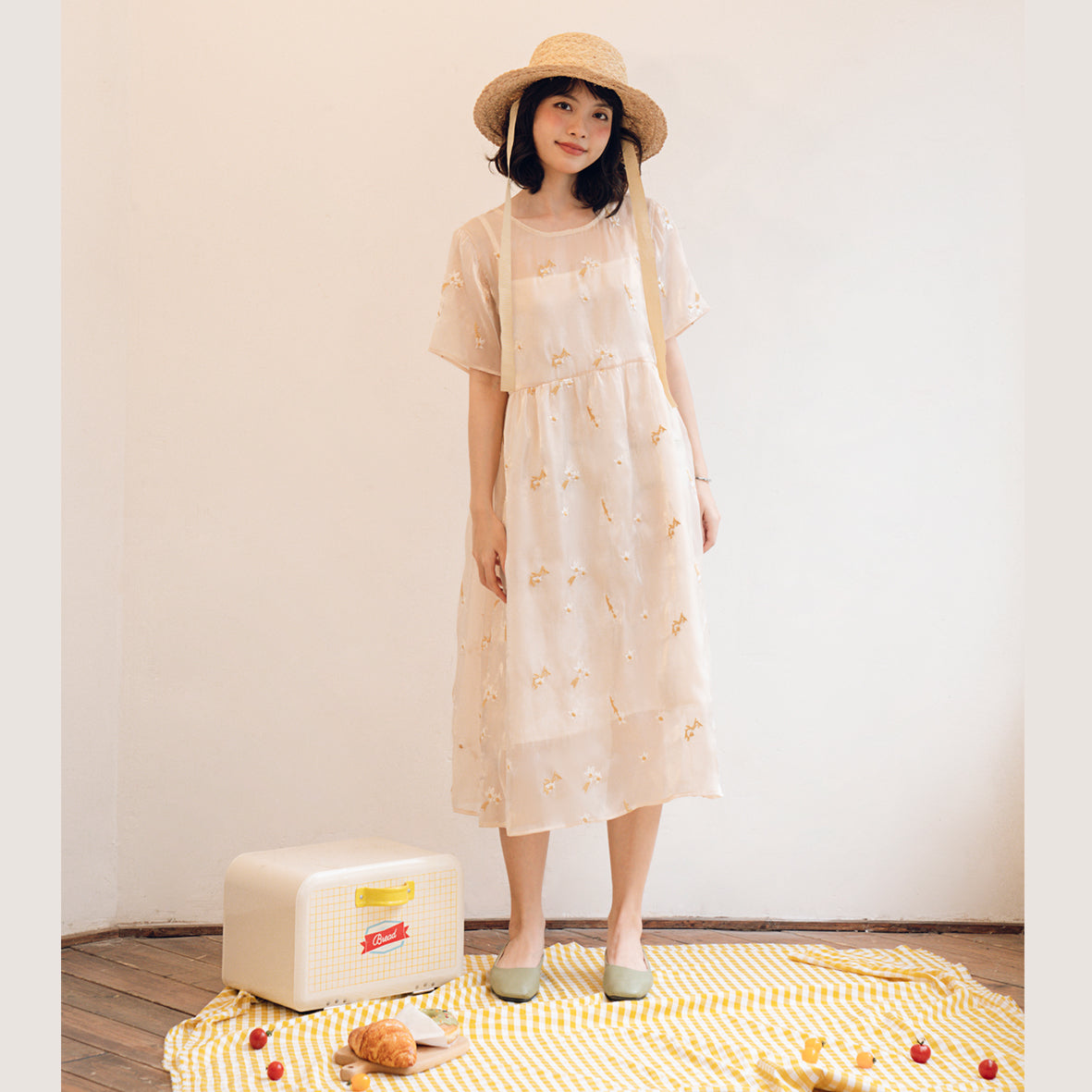 The dress is sewn with organza chiffon fabric with light gloss, embroidered with floral motifs.